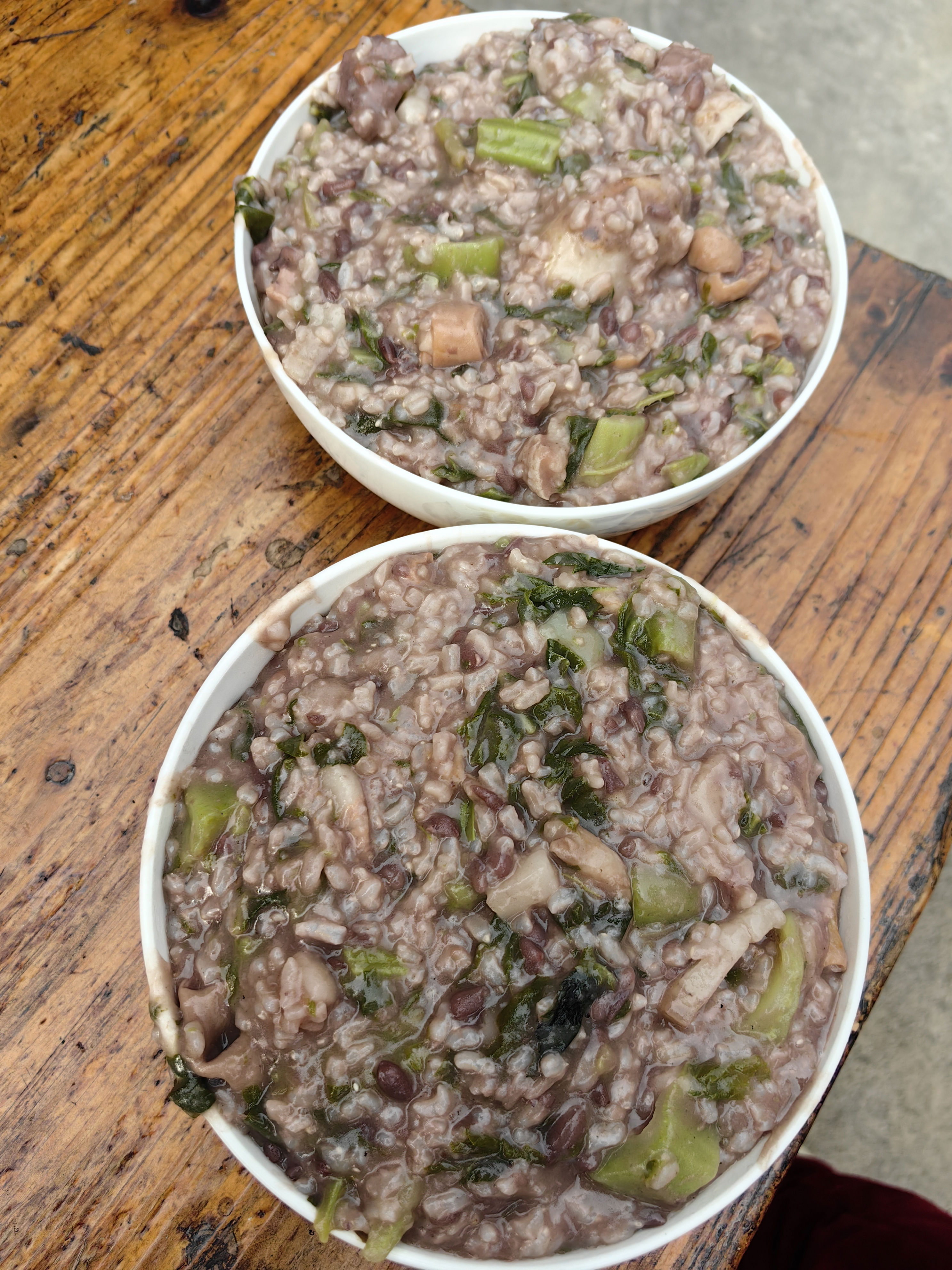 经过两个多小时的精心熬煮,香糯黏软的咸酸粥终于出炉了。村民们纷纷赶来品尝,他们手端饭碗,三三两两地坐在一起,边吃边聊,享受着这份独特的节日美味,心的距离也因此拉得更近了。