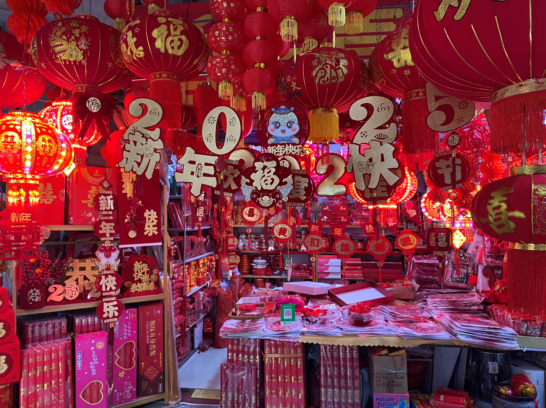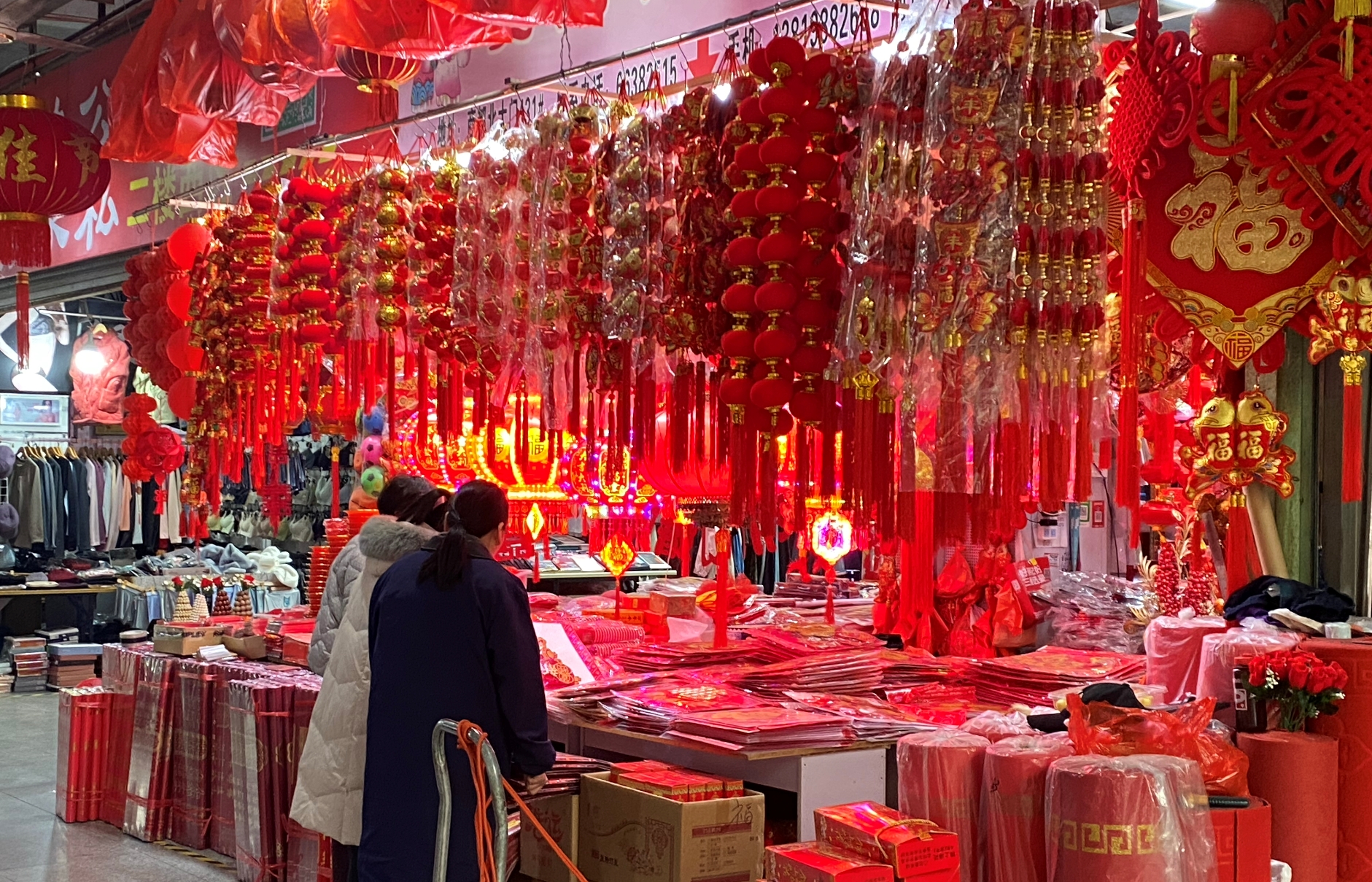 当天中午,记者来到商都一楼,几家售卖日用商品、喜庆用品的店铺看上去“红红火火”,印有“压岁包”“新年快乐”“大吉大利”“恭喜发财”等字样的红包已被置于显著位置。
