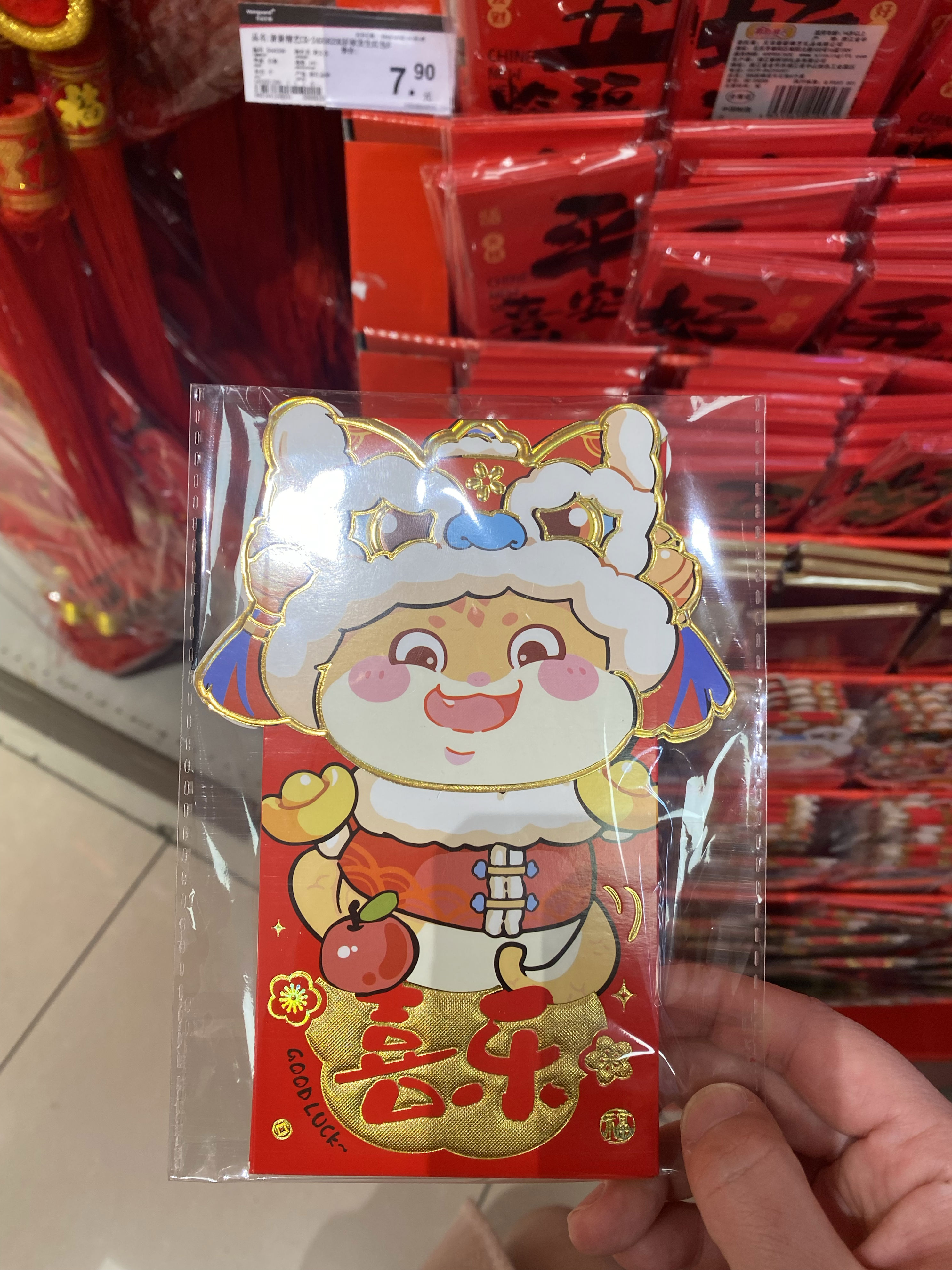 在华润万家香格店,新春红包柜台也被置于超市入口处。印刷的书法红包、烫金的福字红包、卡通蛇红包,不到8元,就能买到一沓。